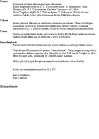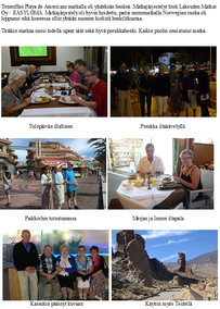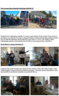TOIMINTAKERTOMUS VUODELTA 2018 Kunto- ja veteraanijaoston toiminta on vuonna 2018 ollut perinteisen kaavan mukaista. Jaosto on kokoontunut neljä kertaa päättämään toimintasuunnitelman edellyttävistä asioista, sekä suunnittelemaan tulevaa. Aivan perinteisen kaavan mukaan tämä vuosi ei kuitenkaan ole mennyt. Maaliskuun viimeisenä päivänä veteraanijaosto ja koko seura koki suuren menetyksen kun Esko Taskinen menehtyi kisamatkalla Sodankylässä. Samalla sulkeutui Esko pitkä urheilija ja seuratoimijan ura, sillä Eskon ensimmäinen kilpailumatka aikoinaan oli juuri Sodankylään, jossa se nyt myös päättyi ensimmäisiin Lapin läänissä painittuihin aikuisten SM-paineihin. Iki-intolaisten ovat kokoontuneet eri teemojen puitteissa pääsääntöisesti kuukauden ensimmäisenä maanantaina alkuvuodesta Pruntsilla. Kun TUL-sali piiritoimiston yhteydessä otettiin käyttöön syyskuun alusta niin kokoukset siirrettiin sinne. Veteraanitapaamiset, kuntoliikuntatapahtumat on järjestetty perinteiseen tapaan, Yhteisenä piirteenä on ollut osallistujamäärien väheneminen. Lassin lenkillä oli 10 osallistujaa, joista pyöräili 5 henkeä, Takajärven mehuaseman hoiti Elsa ja Esko, taukojumpan veti Kirsti. Kemijokipyöräilyssä 15 pyöräilijää, maalipaikalla avustivat Kirsti, Jaana ja Aila. Matkahuollon hoitivat Leena, Toivo, Jaakko, Raimo ja Kassu. Ajoksen veteraanitapaamisessa oli 53 henkeä ja Eeron rastilla 6 kävelijää. Ajoksen tapaamisen alkuvalmistelut hoiti Raimo, Jaakko, Toivo ja Kassu, keittiössä häärivä Marja, Pirkko, Raija ja Hilkka, arvat möi Eeva. Eeron rastilla jumpan veti Kirsti ja Pertajärven mehuaseman, sekä rasvaprosentin mittaukset hoitivat Kalevi N ja Kassu. Kuntoliikunnassa Kirsti on vetänyt naiset 50+ ryhmää, jossa on ollut mukana toistakymmentä naista. Miesten kuntoryhmä Nuijaukot on kokoontunut Syväkankaan koululla perjantaisin Sakari Lindin vetämälle jumpalle ja pelaamaan lentopalloa. Kevätkaudella ryhmä pieneni niin pieneksi, että toiminta lakkasi kesken kauden. Osallistumiskirjaukset ja maksujen perinnän on hoitanut Jaakko. Toukokuussa tehtiin kaksi ulkomaan matkaa. Ensin Mallorcalle 17 henkeä ja Pärnun matkalla oli 49 henkeä. Matkailutoiminnan tuottona on tilitetty seuran pääkassaan 2092 €. Toppilan möljälle tehdylle teatterimatkalla oli ainoastaan 17 osallistujaa ja siitä syntyi 70 €:n tappio, joka jäi Kemin Liikenteen kontolle. Ajoksen veteraanitapaamisen tappio oli 330 € ja sen on korvannut TUL:n Lp. Kalevi 80v- keräys tuotti Hannukselanrannan kehittämiskassaan 2650 €. Seurataustaltaan tenholainen mutta tiiviisti Iki-intolaisten tilaisuuksiin osallistunut Vieno Leinonen täytti 100 vuotta 11.9. Pruntsilla 8.9 järjestetyissä juhlissa hätä kävi kerhon sekä jaoston puolesta kukkatervehdyksin onnittelemassa Eeva Posti ja Unto Mäkelä. TUL:n valtakunnallisille veteraanipäiville 4.-5.6 Porin Yyterissä osallistui Kalevi. Kunto- ja veteraanijaostoon ovat kuuluneet puheenjohtaja Kalevi Heikkinen, sihteeri Unto Mäkelä, varapuheenjohtaja Jaakko Korkala, rahastonhoitaja Marja Vedom, sekä muina jäseninä Eeva Posti, Pirkko Ämmälä, Toivo Rastas, Esko Taskinen, Raimo Kemppainen Raija Laine ja Sirkka Gummerus. Jaoston kokoukset on pidetty TUL:n Lapin piirin kokoustilassa. TUL:n Lapin piirin veteraanijaostoon ovat kuuluneet Esko Taskinen ja Jaakko Korkala, sekä aikuisliikuntajaostoon Kalevi Heikkinen. 2/14 Tapahtumat ja tapaamiset Tammikuu Iki-intolaiset 8.1 Helmikuu Iki-intolaiset 5.2 Esko toivottaa terve tuloa ja esittelee päivän esitelmöijän kirjailija Kari Hanhisuiannon. Kari kertoi kirjoistaan ja kirjoittamisesta. Tämän lisäksi käytiin vilkasta keskustelua Kemin kunnallispolitiikasta. Arto kertoo tapahtumista Kemissä 100 vuotta sitten. Kalevi taas kertoo huhtikuussa tehtävästä Mallorcan matkasta. 3/14 Heiton talolla 27.2 27.2 perinteisellä kyläreissulla Vierivien kivien vieraana Haukiputaalla. Syötiin hyvin, nautittiin mukavasta ohjelmasta, laulettiin ja seurusteltiin. Mukana olivat: Esko, Pirkko, Raija, Jaakko, Hilkka, Toivo, Risto, Reino, Sirkka, ja Kalevi Oulun piirin uusi toiminnanjohtaja Veli-Matti Nieminen kertoili itsestään, sekä liiton uutisia. Havukka-ahon ajatukisia kertoili Eetu ja hupijuttuja Antero Mikkonen. Raija viihdytti laulullaan. 4/14 Hilkka lausuu runoa Risto ratkoo tietietovisaa 5/14 Maaliskuu Iki-intolaisten tapaaminen 5.3 Huhtikuu Iki-intolaiset 5.3 Jaakko harjoittelee kerhoisännän tehtäviä ja kisälliporukan tervetuloa toivotus Kirjastonhoitaja Leena Pitkäsen aiheena oli vanhat kirjat Tätä tapaamista vietettiin surullisin mielin kun Esko oli joukosta poissa. Sosiali- ja terveyslautakunnan pj. Tiilikainen Aaro selosti sotavalmistelun tilannetta 6/14 Perinteiseen tapaan Hilkka lausui runon josta läsnä olevat nauttivat 20.4 Seuran ja veteraanijaoston viimeinen tervehdys Esko Taskiselle Painijoiden jäähyväiset Eskolle 7/14 Mallorcan matkalla 24.4 - 1.5 Härkönen Risto ja Anja, Kotiranta Risto ja Helena, Savolainen Kauko ja Aino, Roininen Arto ja Elsi, Oikari Elias ja Raili, Myllyoja Arja, Savolainen Juha ja Rousu Sanna, Alakokkare Erkki ja Hendrikson Anita, Heikkinen Kalevi ja Marjakaarto Hilkka. Toukokuu Iki-intolaiset 7.5 Pruntsilla Kevään viimeistä tapaamista vietettiin äitienpäivän merkeissä, juotiin täytekakkukahvi ja kuunneltiin Hilkan päivään sopiva runo, sekä Järvisen Pentin ja Tuomivaaran Maurin matkaselostus heidän Intian matkaltaan. 8/14 Pärnun matka 13.-19.5 Kemin Liikenne Oy:n kanssa yhteistoiminnassa 49 hengen ryhmämatka Estonia Medical & SPA kylpylähotelliin. Kaupunkikierroksella Yhteisen iltaman alkua odotellaan Tulo-trinkkien, yhteislaulun, ja arpajaisten lisäksi ohjelmasta vastasivat Raija, Laila sekä Riitta 9/14 37. Lassin lenkki 10.5 Lähtöä odotellessa "Eka-aukiolla" Taukopaikalla venyteltiin Kirstin johdolla, sekä nautittiin Elsa ja Esko tarjosivat mehut. Ajoksen majalla juotiin Sirkan ja Pirkon keittämät 